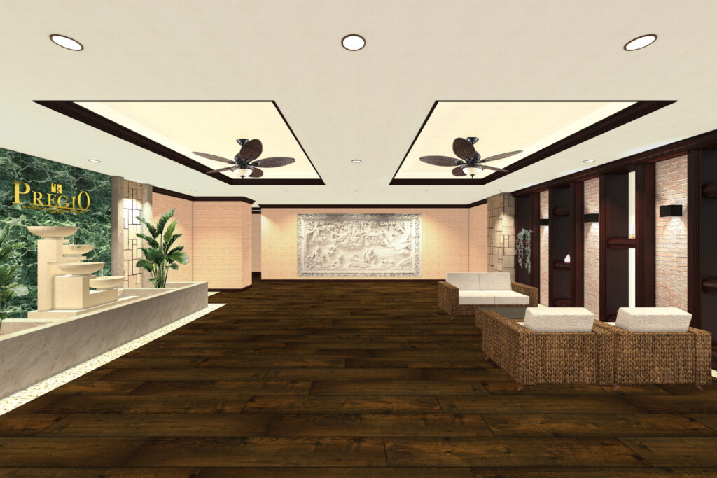 エントランスホールには、バリ現地の職人による手彫りのストーンカービングを設置し、異国情緒あふれる空間を演出しました。さらに、木調タイルの床やラタン調の家具、天井のリゾートファンなど、細部にまでこだわり抜いたデザインで、訪れる人を非日常の癒しへと誘います。左手には水のせせらぎを感じる噴水のオブジェを配置し、水音を楽しみながら、ゆったりとした時間を過ごせる空間を実現しました。まるで南国リゾートの高級ホテルに滞在しているかのような贅沢な雰囲気を、日常の暮らしに取り込むことができます。