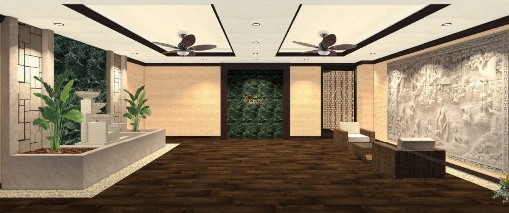 エントランスホールは、アジアの癒しを感じられるくつろぎの空間を演出しています。右の壁面には、バリ現地の職人が一つ一つ手で彫り上げたこだわり溢れるストーンカービングを設置。迫力のあるストーンカービングや噴水から流れる水音が南国リゾートを訪れたかのような雰囲気を醸し出し、入居様に安らぎを与えます。